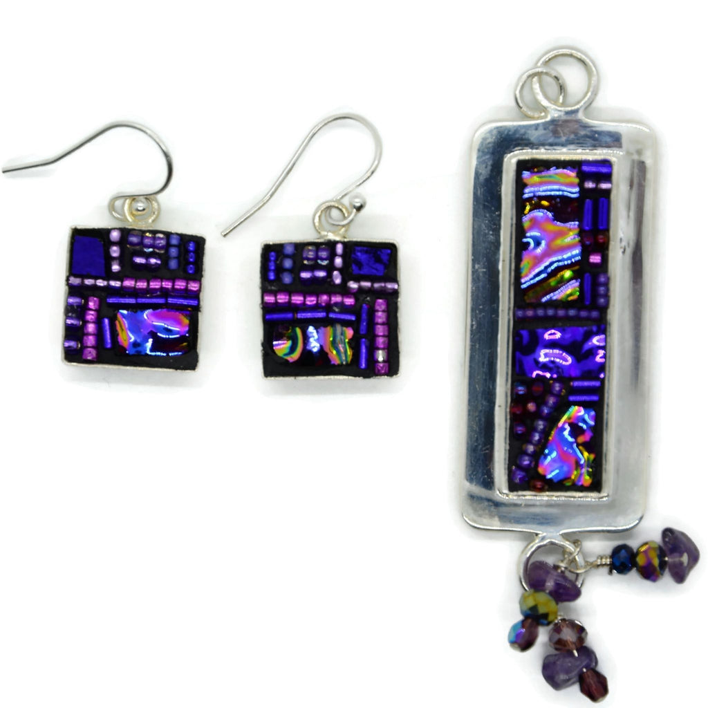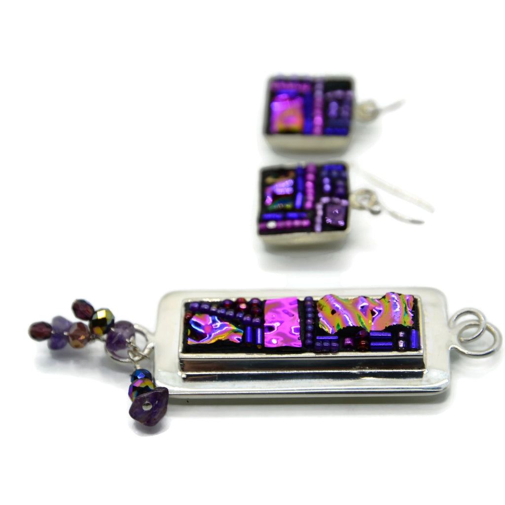 Purple dichroic glass is set with various purple seed beads in silver plated settings. Square earrings. The pendant has 3 dangles of amethyst and Swarovski crystal beads.